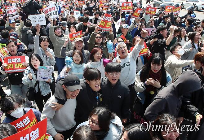 선고 생중계가 이어질수록 지지자들의 입은 거칠어졌다. 몇몇은 머리를 쥐어뜯으며 탄식을 쏟아냈다. 결국 오전 11시 22분 문 권한대행의 입에서 "주문, 피청구인 대통령 윤석열을 파면한다"는 주문이 나오자 지지자들은 비명을 내질렀다.