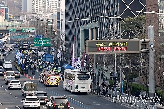 4일 오전 전광훈 사랑제일교회 목사를 주축으로 한 대한민국바로세우기운동본부(대국본) 등이 서울 용산구 대통령 관저 앞에서 '탄핵 무효' 집회를 열었다. 오전 9시께, 메르세데스벤츠 한남서비스센터에서 루터교회까지 약 100m는 4개 차선 중 3개 도로가 집회로 인해 차들의 통행이 막힌 상태다.