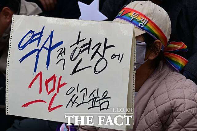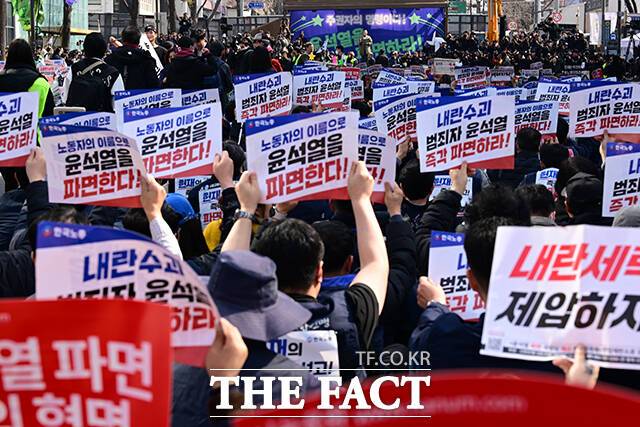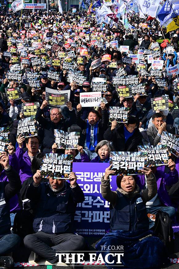 [더팩트ㅣ남윤호 기자] 윤석열 대통령에 대한 탄핵심판 선고일인 4일 오전 서울 종로구 헌법재판소 인근 안국역 도로에서 열린 '윤석열 8대0 파면을 위한 시민결의대회' 참가자들이 파면 선고를 촉구하고 있다.