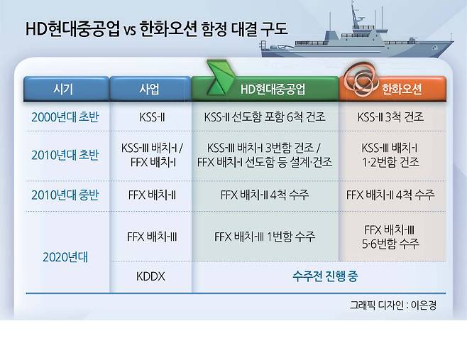 본격적인 대결 구도는 2000년대 들어 해군의 차세대 전력 확보를 위한 KSS-II(손원일급 잠수함)와 울산급 FFX(호위함) 사업에서 시작됐다. 1990년대의 KSS-I 사업엔 HD현대중공업이 참여하지 않았다. KSS-II는 양사가 모두 참여했다. HD현대중공업이 주계약자로 선도함 설계부터 6척을 건조했고 대우조선해양(현 한화오션)이 3척을 건조했다. 당시 사업 배분을 놓고 일부 수주 경쟁 분위기도 있었지만, 정부의 조정에 따라 분담을 했다.