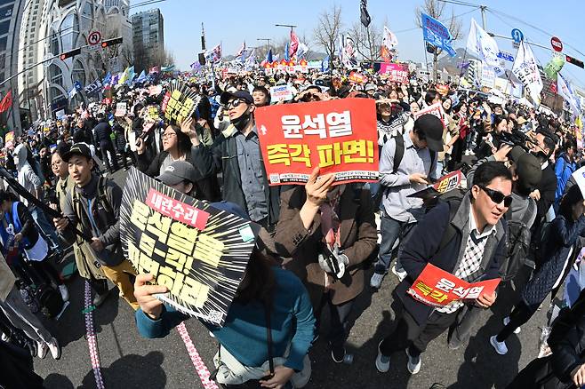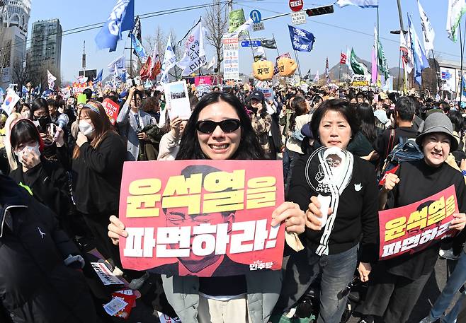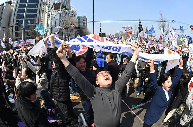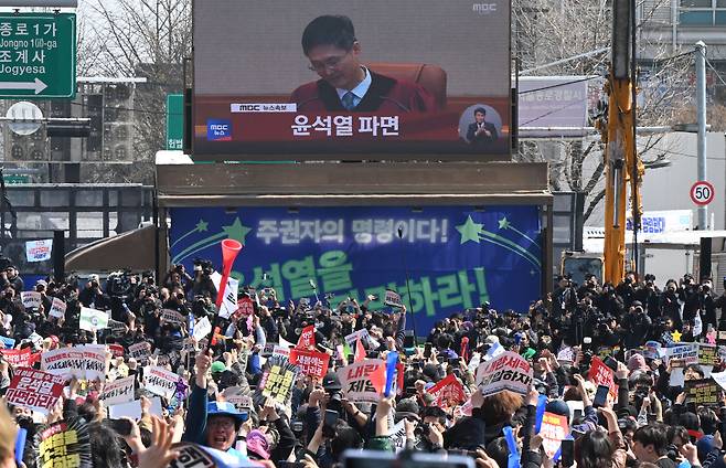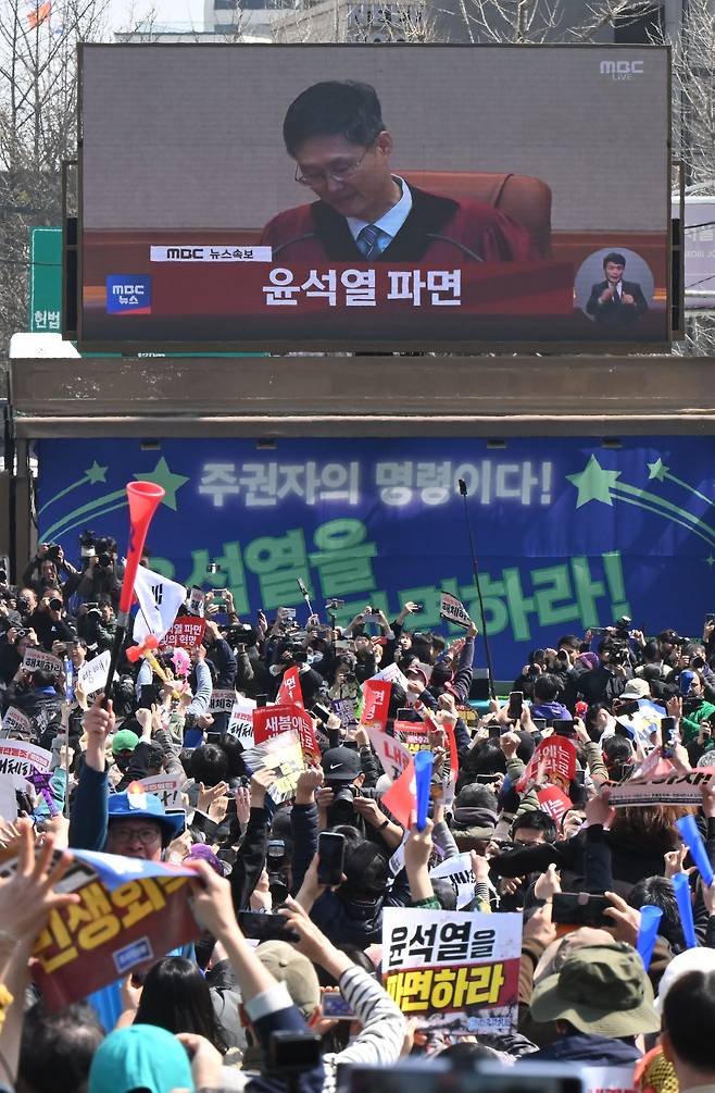 ‘대통령 윤석열을 파면’ 환호하는 탄핵 찬성 측