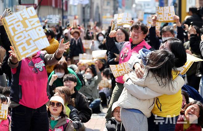 [대구=뉴시스] 이무열 기자 = 윤석열 대통령이 파면된 4일 대구 중구 CGV대구한일 앞에서 윤 대통령 탄핵 찬성 집회 참가자들이 기뻐하고 있다. 2025.04.04. lmy@newsis.com
