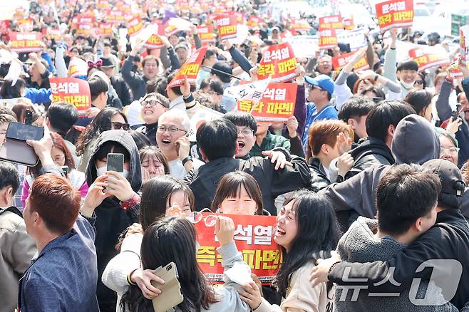 (서울=뉴스1) 민경석 기자 = 4일 오전 서울 용산구 대통령 관저 앞 도로에서 진보단체 회원들을 비롯한 시민들이 헌재의 윤석열 대통령에 대한 탄핵 선고 소식에 기뻐하고 있다. 2025.4.4/뉴스1
