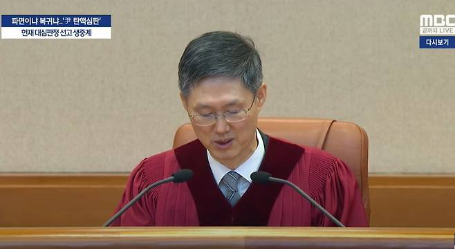 4일 오전 11시 헌법재판소가 윤석열 대통령 탄핵심판 사건의 선고 재판을 개최한 가운데, 이를 생중계한 MBC 채널에.