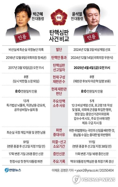[그래픽] 박근혜 - 윤석열 전 대통령 탄핵심판 사건 비교