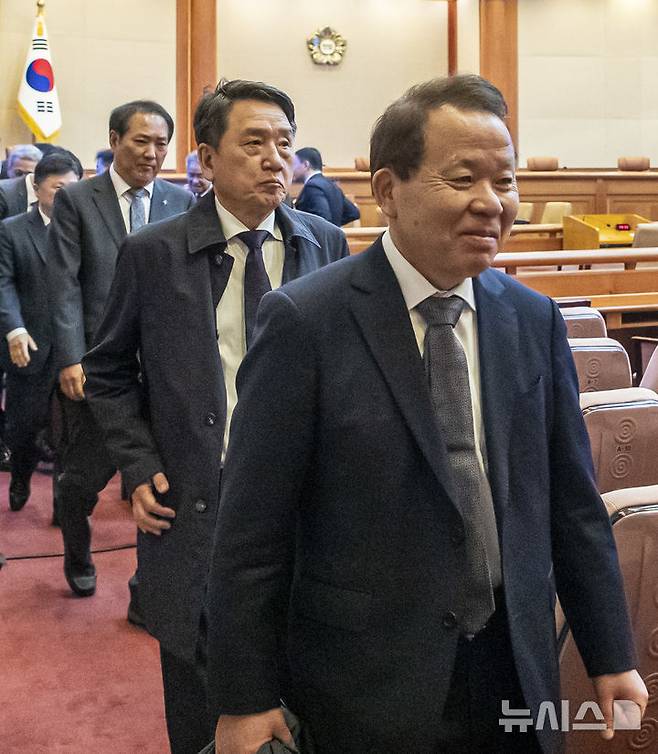 [서울=뉴시스] 사진공동취재단 = 국회 측 변호인단이 4일 오전 서울 종로구 헌법재판소 대심판정에서 열린 윤석열 대통령 탄핵심판 선고 기일을 마친 뒤 나서고 있다. 2025.04.04. photo@newsis.com