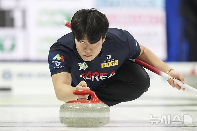 [무스조=AP/뉴시스] 김진훈이 3일(현지 시간) 캐나다 서스캐처원주 무스조에서 열리고 있는 2025 BKT 세계남자컬링선수권 예선 10차전 미국과 경기하며 스톤을 투구하고 있다. 한국이 5-3으로 승리하고 9패 끝에 첫 승을 올렸다. 2025.04.04.
