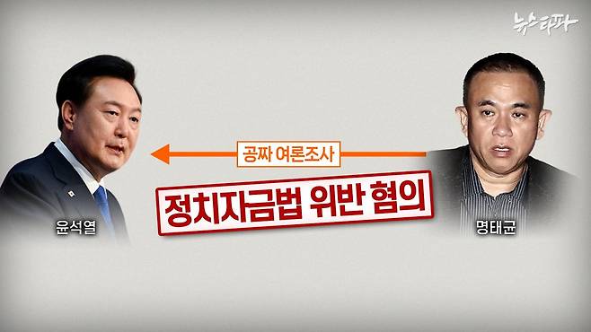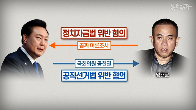 윤 씨는 ①지난 대선 기간, 명 씨로부터 공짜 여론조사를 받아챙겼고 ②그 대가로 당선 이후, 명 씨에게 국회의원 공천권을 줬다. ①정치자금법, 그리고 ②공직선거법 위반 등의 범죄 혐의가 제기된다.