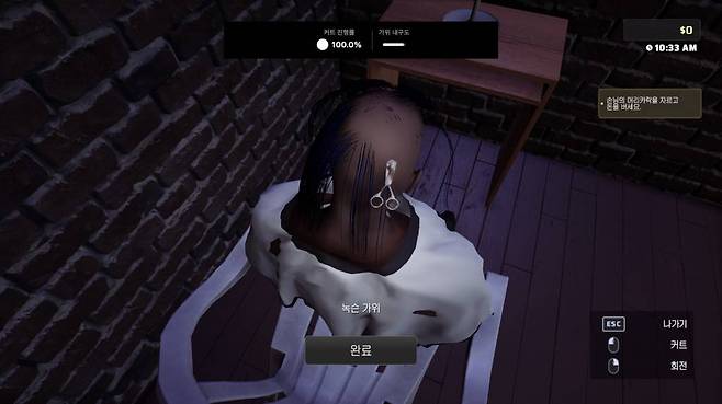 더 황당한 부분은 커트 퍼센티지가 손님의 머리카락이 잘린 정도에 비례해서 올라가기 때문에, 커트를 완료하기 위해서는 손님을 대머리로 만들어야 한다. 장발의 여성은 물론이고, 머리카락 세 가닥 남은 아저씨도 예외 없다. 머리카락 폴리곤도 세밀하지 않아서 조금만 잘라주고 싶어도 머리카락이 숭덩숭덩 깎인다. 손님이 원하는 헤어스타일과 분위기를 말해주면 거기에 맞춰서 머리를 만져주는 타 미용실 시뮬레이션과 차별화되는 부분이다.