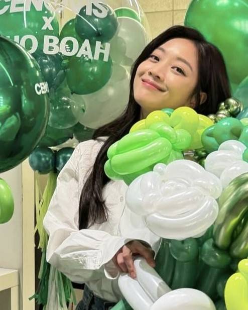 공개된 사진 속 조보아는 브랜드의 상징색인 초록색 풍선으로 꾸며진 공간에서 꽃모양 풍선을 끌어안은 채 행복하게 미소 짓고 있다.
