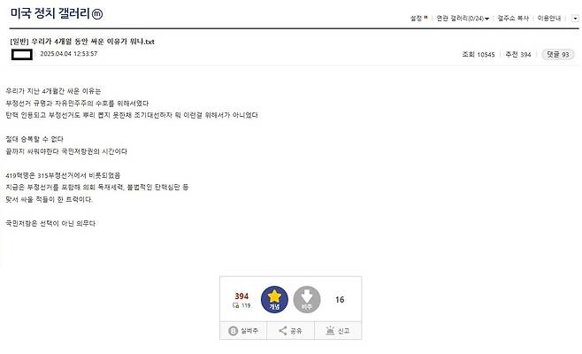 | ▲ 394개의 추천을 받은 한 게시글은 "우리가 지난 4개월간 싸운 이유는 부정선거 규명과 자유민주주의 수호"라고 했다. 헌재가 판결문에서 부정선거의 근거가 없고, 국회를 배제의 대상으로 삼은 윤석열이야말로 민주정치를 허문 장본인이었다고 지적한 것은 이들에게 말 그대로 '쇠귀에 경읽기'였다. |