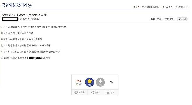 "판결문이 납득이 가야 승복을 하지"라는 제목의 게시글은 "가짜뉴스, 검찰 조서, 홍장원-곽종근 말바꾸기를 전부 증거로 채택하면 대체 헌재는 뭐하러 존재하는 거냐"라며 지지율 50% 대통령도 야당이 일방적으로 탄핵하고 헌재가 이를 받아들이면 대통령이 바뀌는데 대통령 직책이 왜 필요하냐고 욕설과 함께 비난했다.