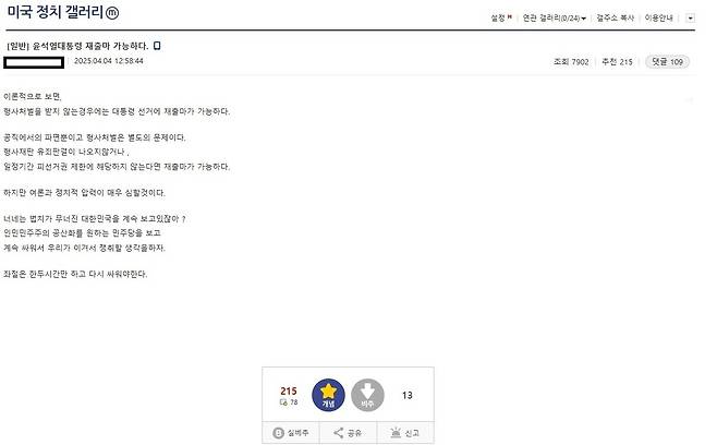 해당 게시글은 "이론적으로 보면 형사처벌을 받지 않는 경우에는 대통령 선거에 재출마가 가능하다. (이번 헌재 판결은) 공직에서의 파면뿐이고 형사처벌은 별도의 문제"라며 "인민민주주의 공산화를 원하는 민주당을 보고 계속 싸워서 우리가 이겨 쟁취할 생각을 하자"라고 했다.