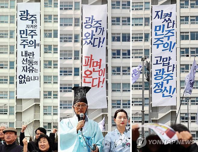 (광주=연합뉴스) 조남수 기자 = 광주비상행동은 윤석열 탄핵 인용이 선고된 4일 광주 동구 금남로 전일빌딩 외벽에 내건 플래카드를 새 문구가 담긴 현수막(오른쪽)으로 교체했다. 왼쪽은 2월 25일 모습이고 가운데는 파면 선고 직전까지 걸렸던 현수막 모습. 2025.4.4