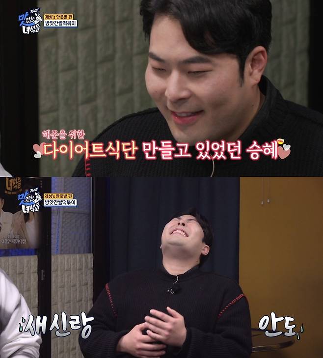 사랑꾼(?) 김해준의 초조한 모습과 아내 김승혜와의 케미는 4일 오후 8시 'THE 맛있는 녀석들'에서 확인할 수 있다.
