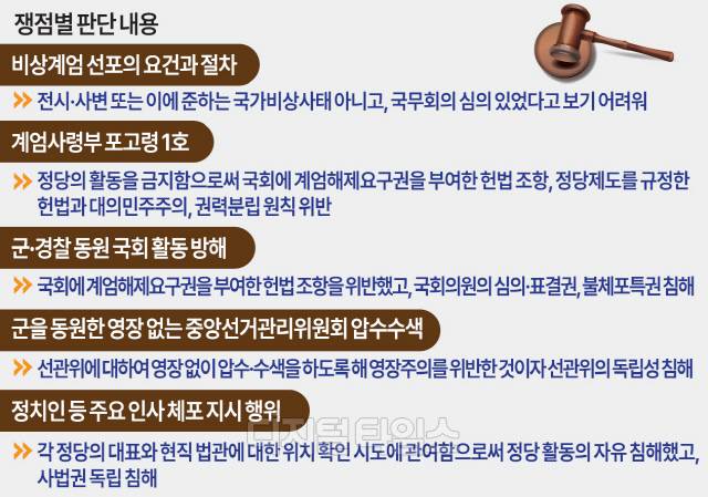 △계엄사령부 포고령 1호= 국회 등 일체의 정치활동을 금지하는 내용이 담긴 계엄포고령 1호에 대해 헌재는 "국회, 지방의회, 정당의 활동을 금지함으로써 국회에 계엄해제요구권을 부여한 헌법 조항, 정당제도를 규정한 헌법 조항과 대의민주주의, 권력분립 원칙 등을 위반했다"고 판단했다. 헌재는 또 "비상계엄하에서 기본권을 제한하기 위한 요건을 정한 헌법 및 계엄법 조항, 영장주의를 위반하여 국민의 정치적 기본권, 단체행동권, 직업의 자유 등을 침해했다"고 밝혔다.