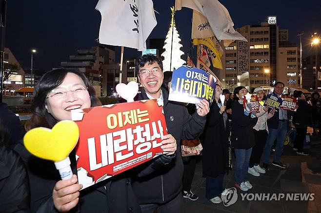 (광주=연합뉴스) 김혜인 기자 = 헌법재판소가 윤석열 대통령 파면을 선고한 4일 광주 동구 5·18민주광장에서 열린 광주시민 승리대회에서 시민들이 피켓을 들고 구호를 외치고 있다. 2025.4.4