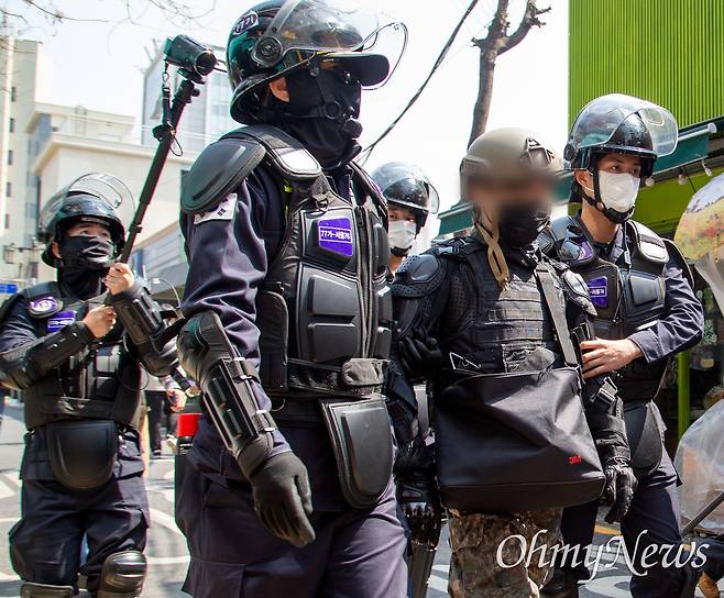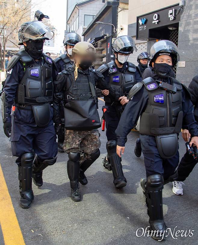 군복, 헬맷, 신체 보호대 등 시위진압 경찰 못지않은 장비를 착용한 모습으로 연행되고 있다.