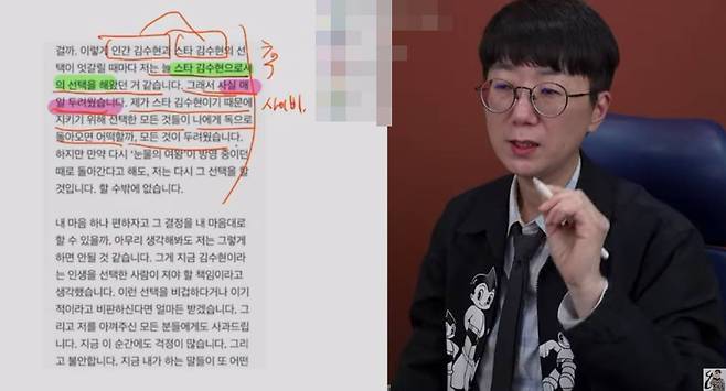또한 "본인 부담감, 스타로서의 부담감 이건 본인 사정이지 않냐. 충분히 이해해 주는 것처럼 바라냐. 미성년자 때 김새론 님이랑 사귀었으면 사귀었다, 안 사귀었으면 왜 그런 카톡 보내게 됐는지, 뭐 예를 들면 김새론 배우가 저를 너무 좋아해서 그렇게 했다, 그런 걸 해야 한다. 지금 그거 아니다. 공개된 카톡에 대해서 해명해야 한다. 본인 피해 위주로 얘기하고 있다. 대중들 입장으로 생각을 해야 하는데. 이건 논점 흐리기"라고 말했다.