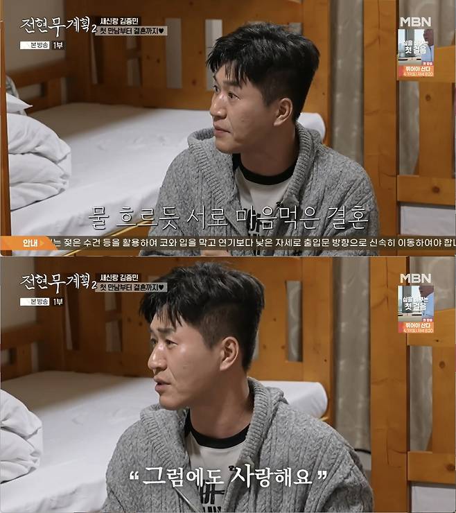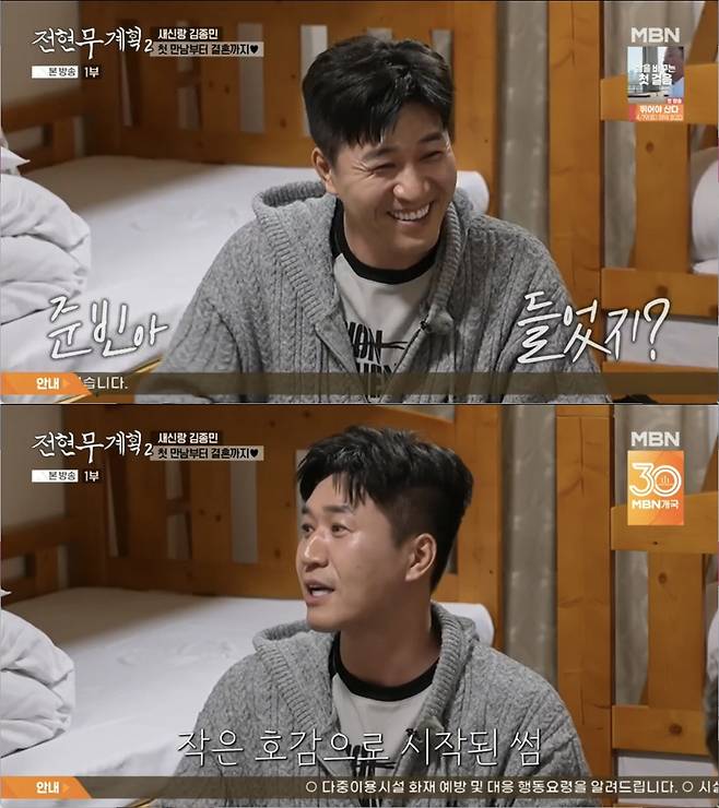 전현무는 "너도 처음에 '괜찮다' 하다라 두 세번 만났을 때 갸우뚱할 수도 있는 거였다. 마음의 문이 열렸다가 닫힐 수도 있는데 열린 거다"라 했고 김종민은 "열린 게 아니라 뒤집어 까지더라. 점점 더 좋아졌다. '이거 뭐지?' 싶었다. 특이했다"라며 환하게 웃었다.