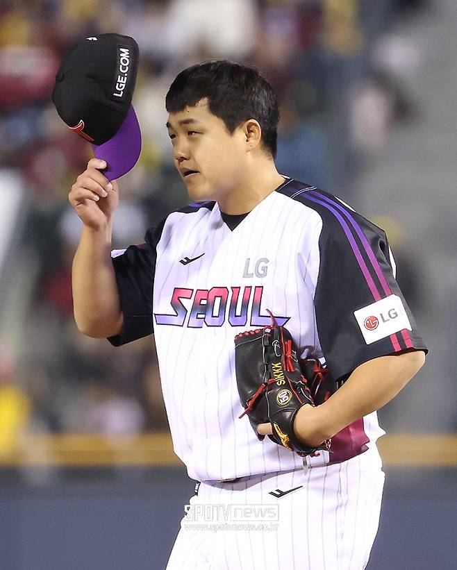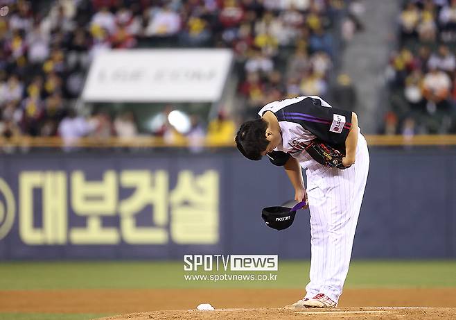 줄무늬 유니폼을 입고 첫 등판을 한 LG 장현식이 3루 관중석을 바라보며 90도 인사를 했다.