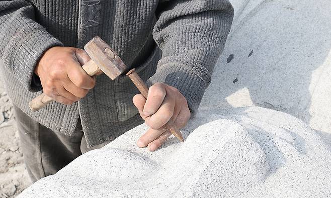 약사여래불 조성 중인 고석산 석장이 도드락망치질을 하며 표면을 고르고 있다.