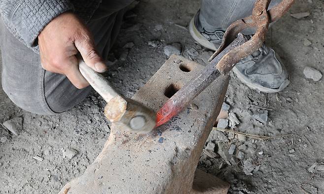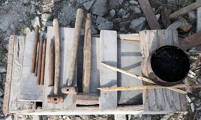 전통방식으로 고석산 석장이 직접 제작한 석공예 도구를 불에 달궈 고치고 있다.