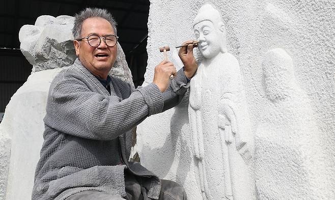 고석산 석장이 보령시 웅천읍 작업장에서 석가여래좌불을 조성(불상 조각)하고 있다.