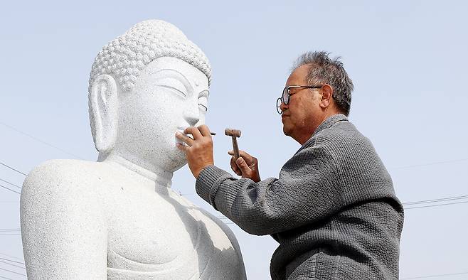 고석산 석장이 보령시 웅천읍 작업장에서 석가여래좌불을 조성(불상 조각)하고 있다.