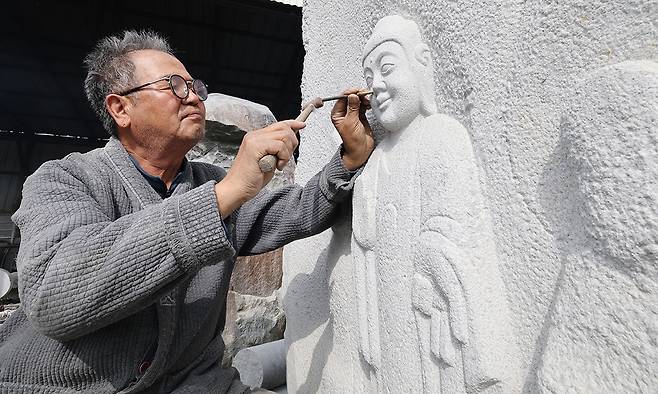 고석산 석장이 망치와 세밀한 조각정으로 해수관세음보살 조성에 집중하고 있다.