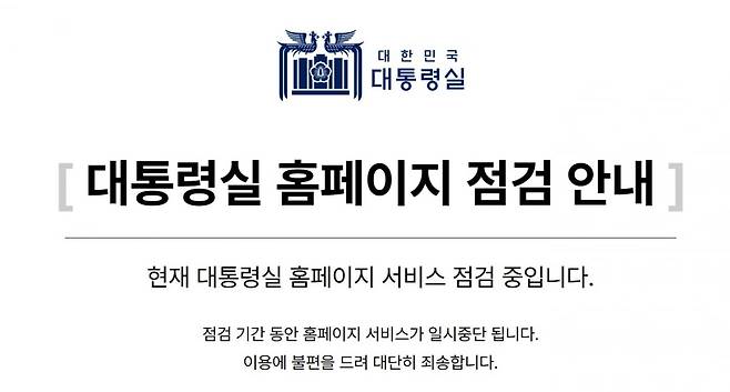 해당 메시지에는 '현재 대통령실 홈페이지 서비스 점검 중이다. 점검 기간 동안 홈페이지 서비스가 일시 중단 된다. 이용에 불편을 드려 대단히 죄송하다'는 문구가 적혀있다.