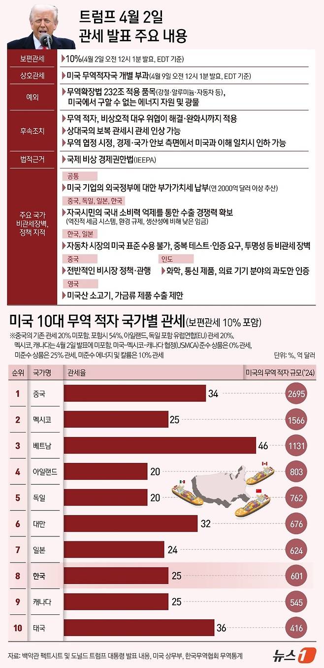 6일 산업통상자원부 등에 따르면 미국은 지난 2일(현지시간) 한국에 보편 관세 10%에 징벌적 상호 관세 15%를 추가한 총 25%의 관세 부과를 확정했다. 미국은 환율 조작 및 무역 장벽을 포함해 한국이 미국 제품에 50%의 관세를 부과하고 있다고 보고, 그 절반인 25%를 상호관세로 부과했다고 밝혔다. 이는 중국(34%), 베트남(46%), 대만(32%) 등보다 낮고 유럽연합(EU·20%), 일본(24%), 영국(10%) 등보다는 높다.