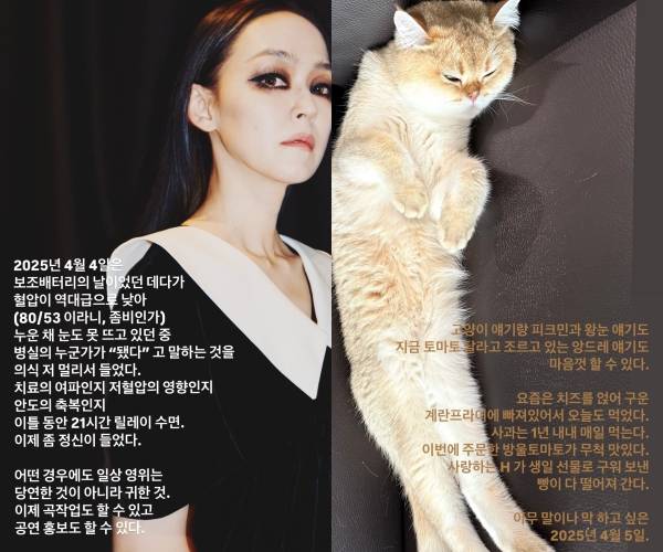 김윤아는 5일 "2025년 4월 4일은 보조배터리의 날이었을 뿐만 아니라, 혈압이 역대급으로 낮았던 날. 혈압이 80/53이라니, 내가 좀비인가 싶었다"고 밝혔다.