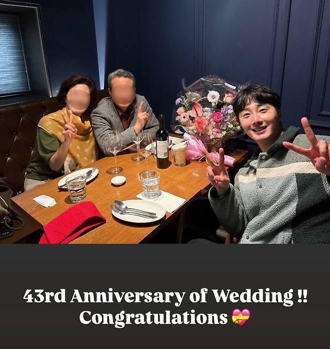 이어 공개한 다른 사진에서 정일우는 "43주년 결혼기념일. 축하합니다"라며 부모님과 함께한 모습을 공개해 눈길을 모았다.