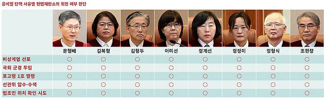 이 밖에 ‘탄핵소추안을 법사위 조사 없이 의결했다’ ‘탄핵소추안이 반복 발의돼 일사부재의의 원칙에 반한다’ ‘대통령 지위를 탈취하기 위해 탄핵소추권을 남용했다’는 윤석열 측 주장 또한 헌재는 받아들이지 않았다. 적법 요건을 모두 채웠으므로 각하 결정은 없다. 이제 ‘윤석열의 행위가 탄핵할 만한지’ 논하는 본안 판단으로 들어간다.