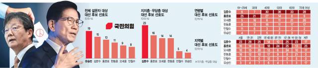 지역별로는 광주·전남(23%), 서울(22%), 인천·경기(19%), 대전·세종·충청(19%) 등 대다수 지역에서 유 전 의원의 강세가 도드라졌다. 대체로 진보·중도 성향의 유권자들이 포진한 지역이다. 다만 전통적인 보수 텃밭인 대구·경북과 강원에서는 홍 시장과 김 장관이 각각 20%의 가장 높은 지지율을 기록했다.