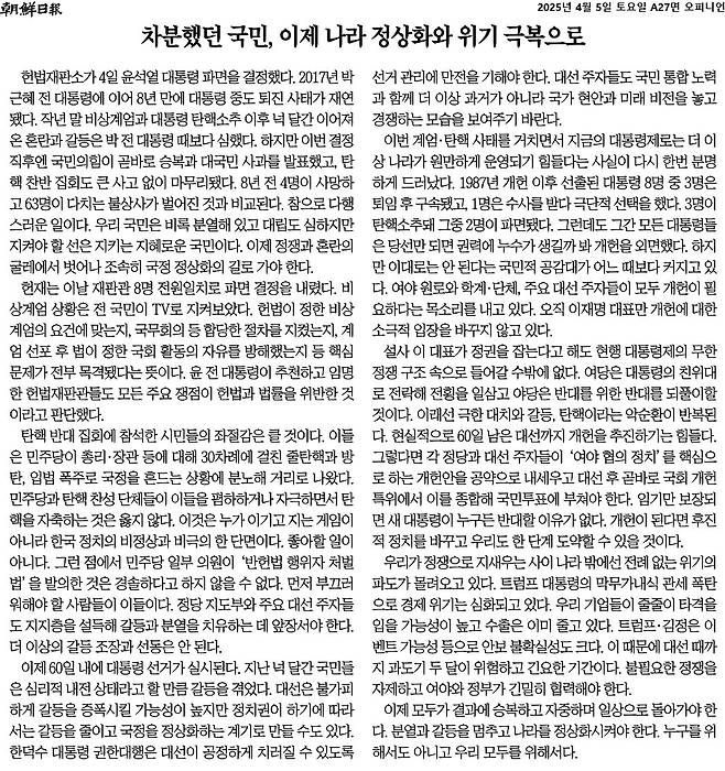 | ▲ "차분했던 국민, 이제 나라 정상화와 위기 극복으로"라는 제목의 사설은 윤석열 파면에 대해 "윤 대통령이 추천하고 임명한 헌법재판관들도 모든 주요 쟁점이 헌법과 법률을 위반한 것이라고 판단했다"며 건조하게 서술했을 뿐이었다. |