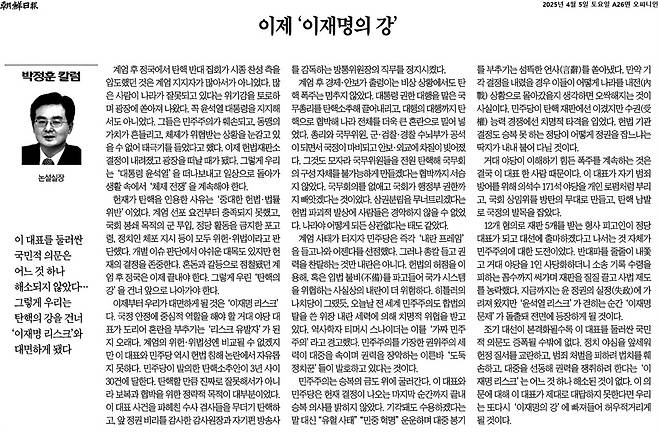 | ▲ 이날 실린 박정훈 논설실장의 "이제 '이재명의 강'"이라는 제목의 칼럼 또한 윤석열의 잘못과 책임에는 침묵으로 일관했다. 대신 이재명 대표와 민주당을 향한 힐난으로 칼럼을 가득 채웠다. |
