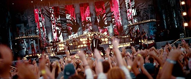실제 로비 윌리엄스의 역사적 공연과 무대를 재현한 세트와 실제 자료 화면을 참조한 특수효과가 교묘하게 배합되어 관객을 시각적 황홀경으로 이끈다. 이 영화를 만든 감독의 전작이 근대 서커스의 창시자 일대기를 구현한 <위대한 쇼맨>이란 점을 떠올린다면, 그야말로 지상 최고의 볼거리를 관객에게 제공하겠다는 비장한 결의 격이다. 그만큼 <베러맨>이 선물하는 감각적 체험은 어마어마하다. 그래서 대화면에 음향설계 잘 된 상영관이 필수다. 음악영화 아니던가.