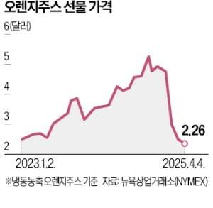 지난 4일 뉴욕상업거래소(NYMEX)에서 오렌지주스 선물(냉동농축 오렌지주스)은 3.28% 떨어진 파운드당 2.269달러에 거래됐다. 장중 한때 2.111달러까지 추락, 2023년 1월 31일 이후 2년3개월여 만에 최저 수준을 기록했다.