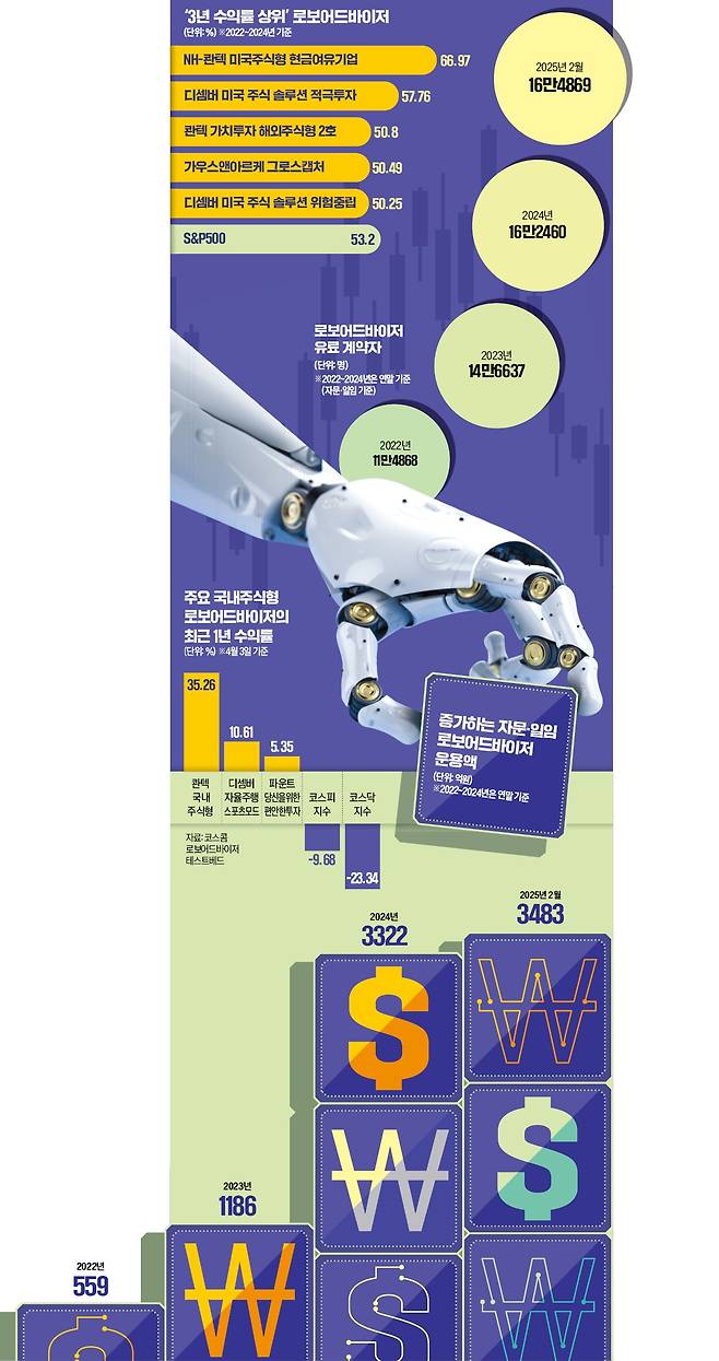 6일 코스콤에 따르면 핀트, 콴텍, 에임(AIM), 파운트 등 자문·일임 로보어드바이저 운용 금액은 3483억원으로 2023년 말 1186억원 대비 약 3배로 늘었다. 자문·일임은 로보어드바이저업체에 돈을 맡기고 수수료를 내는 유료 운용 서비스 형태다. 인간 프라이빗뱅커(PB)가 아니라 AI가 운용하는 자금이 급격히 늘고 있는 것이다. 이 서비스에 가입한 사람은 2022년 말 11만4868명에서 올 2월 말 16만4869명으로 2년여 만에 약 5만 명(43.5%) 증가했다.