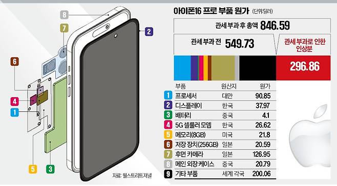 WSJ는 미국이 중국산 부품에 54% 추가 관세, 한국과 일본산 부품에 각각 25%와 24%의 상호관세 등을 부과하면 아이폰16프로의 부품 원가는 846.59달러로 54%가량 오를 것으로 예상했다.