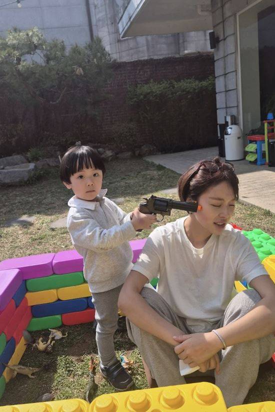 공개된 사진 속 황정음은 두 아들을 데리고 지인들과 공동육아를 하고 있는 모습. 블럭 장난감에 둘러싸인 그는 아들의 총에 인상을 찌푸리고 있는 모습이다.