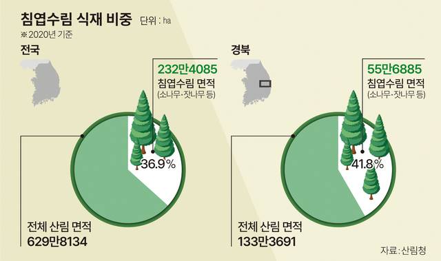 ◆“소나무 지원 없애고 활엽수 심어야”=이런 상황에서 경북지역의 높은 침염수림 비중은 나라 전체적으로 소나무 심기를 중단해야 한다는 여론으로 이어지고 있다. 산림청에 따르면 경북지역 산림면적 중 침염수림 비중은 2020년 기준 41.8%로 전국 평균(36.9%)보다 높다.