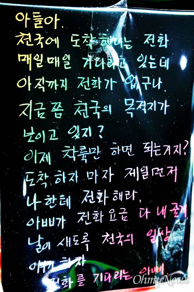 | ▲ "천국에 도착했다는 전화 매일매일 기다리고 있는데 아직까지 전화가 없구나. 도착하자마자 제일 먼저 나한테 전화해라. 아빠가 전화 요금 다 내줄게." |