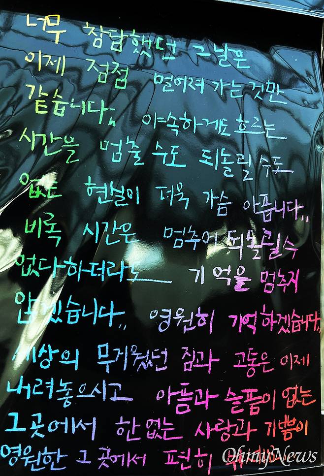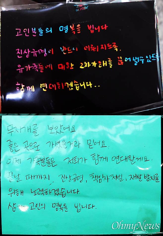 "무지개를 보았어요. 좋은 곳으로 가셨을 거라 믿어요. 이제 가족 분들과 저희가 함께 연대할게요. 끝날 때까지 진상규명, 책임자 처벌, 재발 방지를 위해 노력하겠습니다. 삼가 고인의 명복을 빕니다."