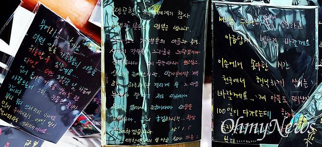 "남아 있는 가족분들의 아픔과 충격. 시간이 갈수록 그리움은 더할 것이라 짐작합니다. 매순간마다 보고 싶고 심장이 조여오지만 받아들이기를 거부하고 하루하루를 견디게 될 그 마음 누구보다 잘 아는 저도 이곳에서 유가족 옆에서 조금이나마 마음을 보탭니다. 부디 굳건하시길. - 대한민국의 또 다른 참사 가족."