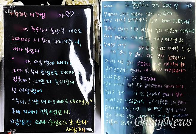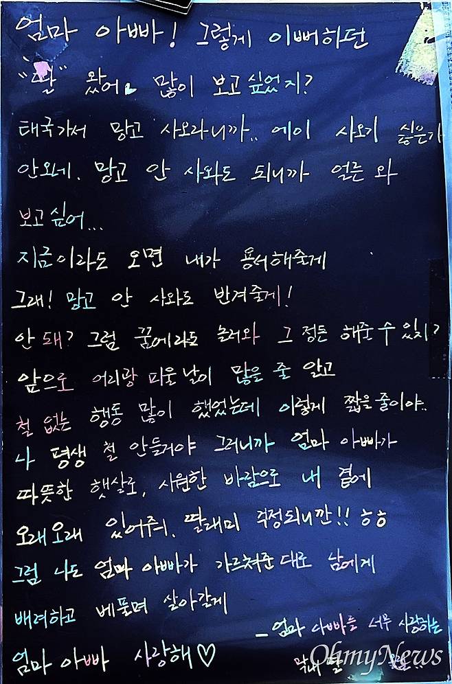 "엄마·아빠! 그렇게 이뻐하던 딸 왔어. 많이 보고 싶었지? 태국 가서 망고 사 오라니까 사 오기 싫은지 안 오네. 망고 안 사와도 되니까 얼른 와. 보고 싶어. 앞으로 어리광 피울 날이 많을 줄 알고 철없는 행동 많이 했었는데 이렇게 짧을 줄이야. 나 평생 철 안 들 거야. 그러니까 엄마·아빠가 따뜻한 햇살로, 시원한 바람으로 내 곁에 오래오래 있어 줘. 그럼 나도 엄마 아빠가 가르쳐준 대로 남에게 배려하고 베풀며 살아갈게."