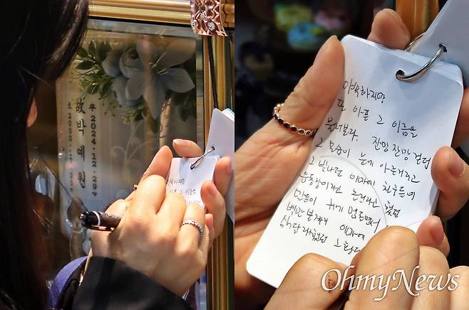 | ▲ 12.29 제주항공 여객기 참사 유족 이효은(고 박예원씨 어머니)씨가 3월 25일 광주 북구 새로나추모관에서 딸의 봉안함 옆에 걸려 있는 수첩에 편지글을 적고 있다. |