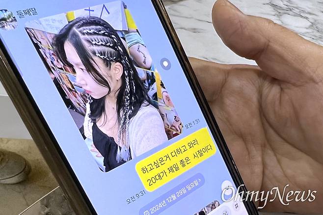 제주항공 여객기 참사로 숨진 고 박예원씨의 어머니 이효은씨는 지금도 딸에게 카카오톡 메시지를 보낸다. 메시지 옆의 '1'은 2024년 12월 29일 이후 사라지지 않는다.